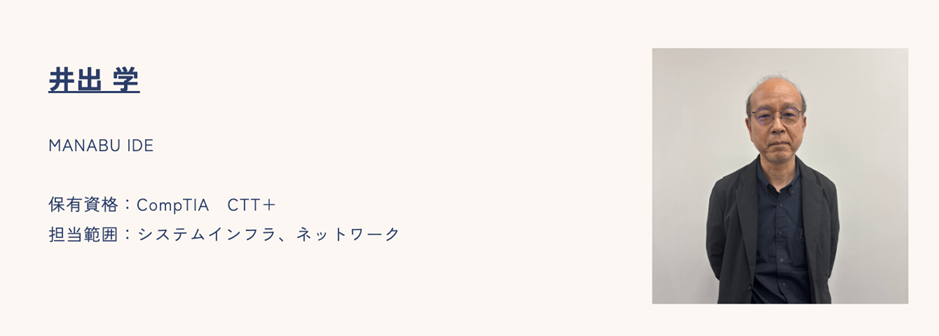 私の専門性としては、長年ネットワークの研修に携わってきており(Cisco認定なども含む)、ネットワークの基本的なところは、できるだけ相手に理解してもらえるよう分かりやすい研修を提供できる自負があります。