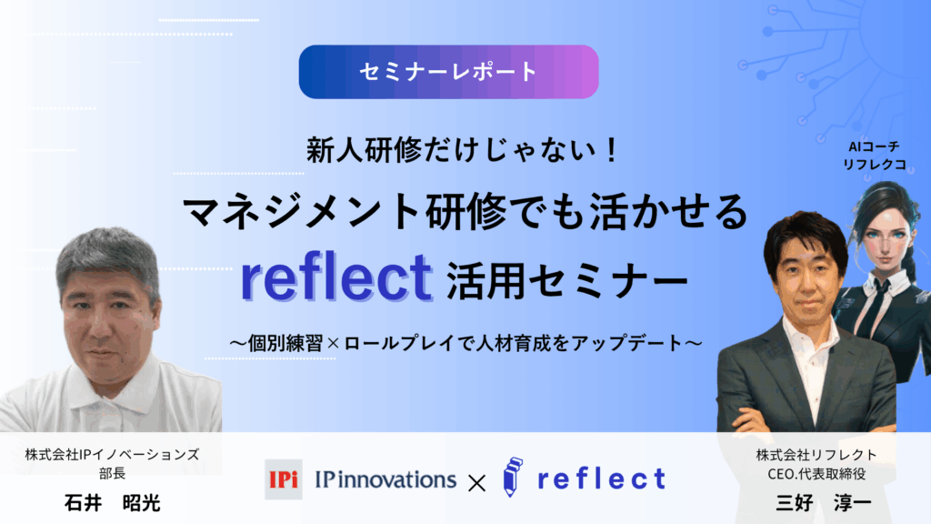 株式会社IPイノベーションズは2025年11月7日(金)、株式会社リフレクト社との共催セミナーを開催いたしました。今回のテーマは「新人研修だけじゃない!マネジメント研修でも活かせるAI人材育成ツール reflect」。